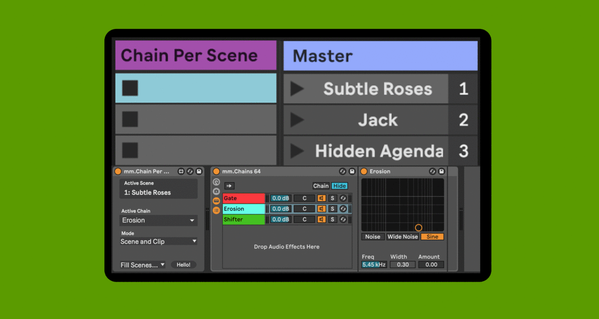 Simplify your Live set by linking an audio effect/instrument chain to each scene in your set